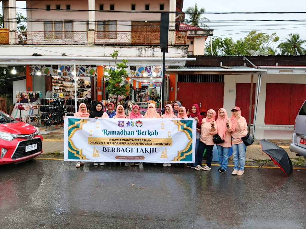 Kota Gorontalo – Dharma Wanita Persatuan (DWP) Unit Dinas Kelautan dan Perikanan (DKP) Provinsi Gorontalo menggelar kegiatan berbagi takjil bagi masyarakat, Jumat (21/3). Acara yang berlangsung di Jalan depan Diler Hino, Jl. Prof. DR. Jhon Aryo Katili, Tanggikiki, Kecamatan Sipatana, Kota Gorontalo, ini tetap berjalan meskipun hujan mengguyur lokasi kegiatan.
