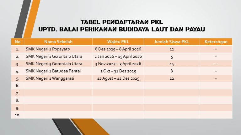 Kuota peserta Praktek Kerja Lapangan (PKL) di UPTD Balai Perikanan Budidaya Laut dan Payau (BPBLP) untuk setiap periode dibatasi minimal 10 orang dan maksimal sebanyak 20 orang setiap sekolah, guna menjaga efektivitas pelaksanaan kegiatan serta memastikan kualitas pembimbingan.
